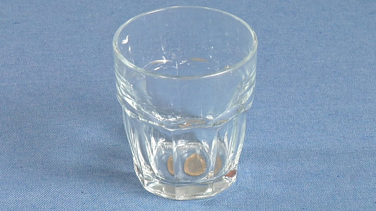 vaso de cristal y una jarra de agua, Introduce en el fondo del vaso una moneda,